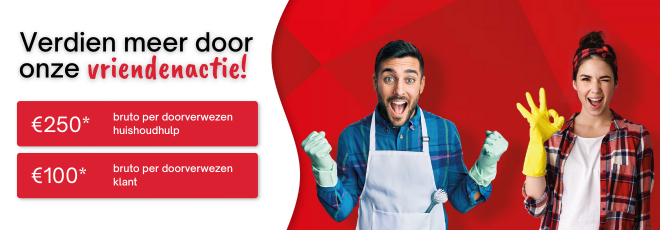 - In 2023, de mogelijkheid om deel te nemen aan een vriendenactie dat u een bruto bonus van € 250,00 per gesponsorde huishoudhulp en € 100,00 per gesponsorde klant kan opleveren